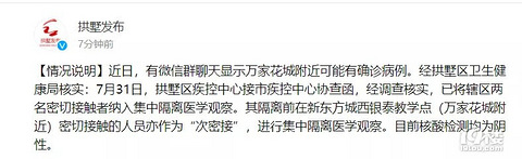 今天上午,“拱墅发布”微信公众号发布一则情况说明: 近日,有微信群聊天显示万家花城附近可能有确诊病例。经拱墅区卫生健康局核实:7月31日,拱墅区疾控中心接市疾控中心协查函,经调查核实,已将辖区两名密切接触者纳入集中隔离医学观察。其隔离前在新东方城西银泰教学点(万家花城附近)密切接触的人员亦作为“次密接”,进行集中隔离医学观察。目前核酸检测均为阴性。 图片 今天上午 新东方杭州学校发布公告 内容如下