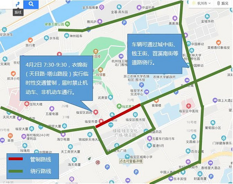 关于临安区“清明恭祭钱王”活动期间实行交通管控措施的通告 为保障临安区“清明恭祭钱王”活动顺利开展,根据《中华人民共和国道路交通安全法》第39条之规定,公安机关交通管理部门届时将调整部分道路的交通组织措施。现将有关事项通告如下: 2023年4月2日上午7时30分至9时30分,衣锦街(天目路至塔山路路段)实行临时性交通管制措施,届时禁止机动车、非机动车通行,车辆可通过城中街、钱王街、塔山路、苕溪南街