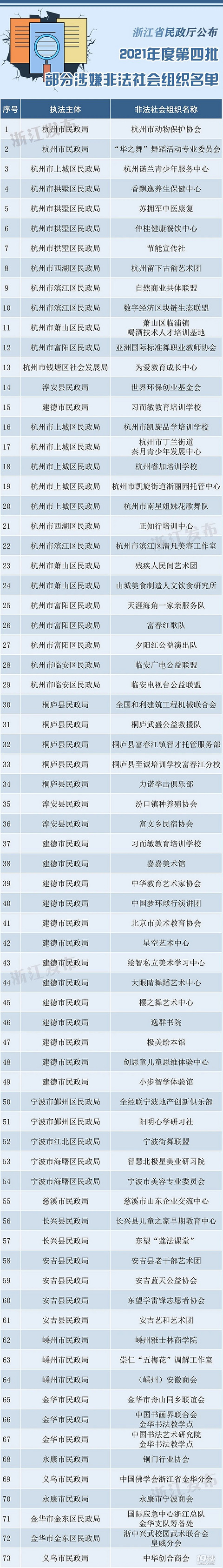为进一步加大对非法社会组织的打击整治力度,提高公众防范意识,充分发挥社会监督作用,省民政厅近日公布新一批涉嫌非法社会组织名单,请社会公众提高警惕,谨防受骗上当。021年6月以来,浙江各级民政部门联合有关部门持续以高压态势深入开展打击整治非法社会组织工作,依法处置了一批非法社会组织,有力打击了非法社会组织嚣张气焰,净化了社会组织发展环境,维护了人民群众合法权益。来源:浙江发布