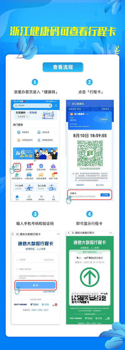 今天起 浙江健康码可以查看行程卡了 近日,全国多地疫情出现反复,浙江省疫情防控措施全面升级。为服务疫情的精准防控,助力群众安全出行,“浙江健康码”优化融合行程信息、核酸检测结果等多项服务信息,“一码通行”更便捷。 8月11日凌晨开始,通过“浙江健康码”可直接链接至“通信大数据行程卡”,方便群众出入医疗机构等重点场所时快速打开“通信大数据行程卡”核验行程信息。 浙里办APP查询行程卡流程 支付宝A