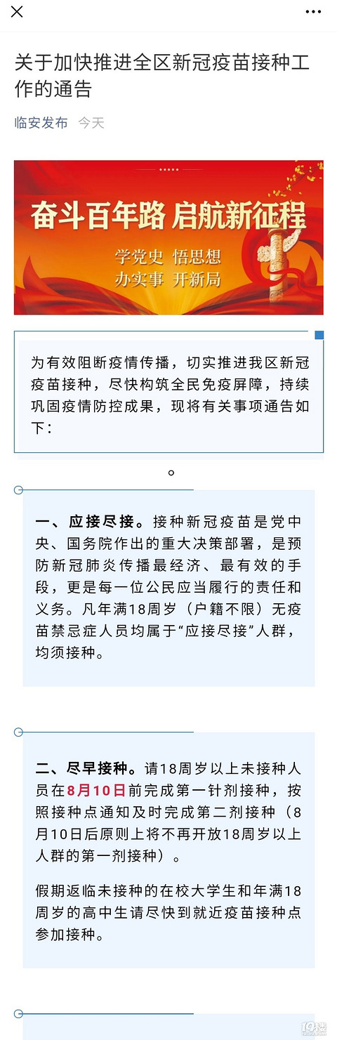 为有效阻断疫情传播,切实推进我区新冠疫苗接种,尽快构筑全民免疫屏障,持续巩固疫情防控成果,现将有关事项通告如下: 一、应接尽接。接种新冠疫苗是党中央、国务院作出的重大决策部署,是预防新冠肺炎传播最经济、最有效的手段,更是每一位公民应当履行的责任和义务。凡年满18周岁(户籍不限)无疫苗禁忌症人员均属于“应接尽接”人群,均须接种。 二、尽早接种。请18周岁以上未接种人员在8月10日前完成第一针剂接种,