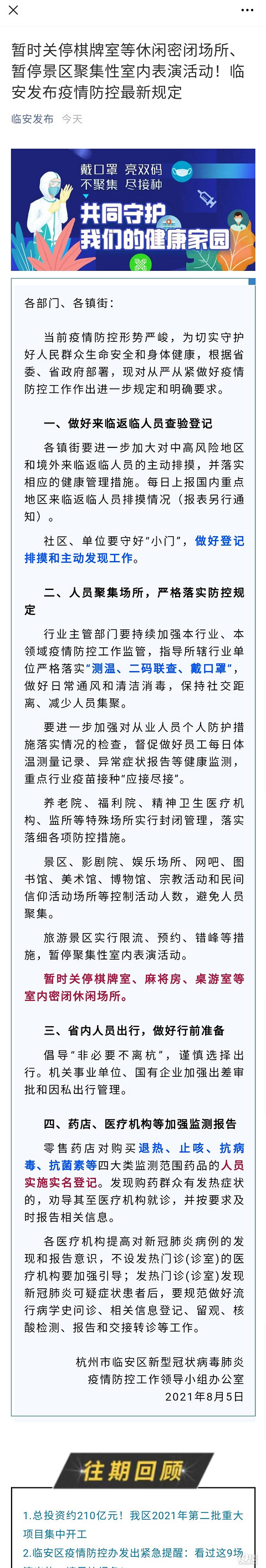 暂时关停棋牌室等休闲密闭场所、暂停景区聚集性室内表演活动!临安发布疫情防控最新规定各部门、各镇街: 当前疫情防控形势严峻,为切实守护好人民群众生命安全和身体健康,根据省委、省政府部署,现对从严从紧做好疫情防控工作作出进一步规定和明确要求。 一、做好来临返临人员查验登记 各镇街要进一步加大对中高风险地区和境外来临返临人员的主动排摸,并落实相应的健康管理措施。每日上报国内重点地区来临返临人员排摸情况(
