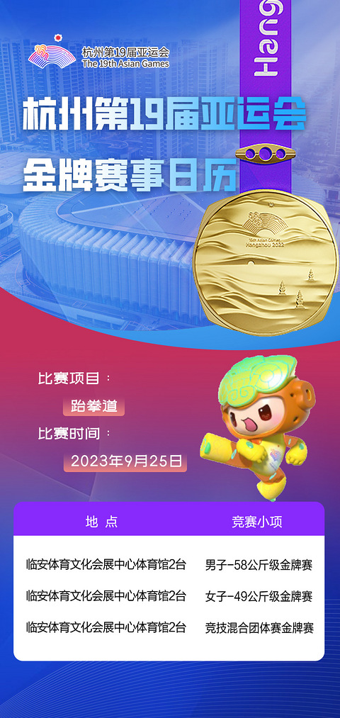 9月25日杭州亚运会将有哪些精彩赛事?快来了解今日赛程 临安体育文化会展中心体育馆将产生三枚金牌一起来看 中国队将参加竞技混合团体赛,中国队运动员程凯将参加男子58公斤级的比赛,郭清将参加女子49公斤级的比赛。预祝中国队取得好成绩。 实时动态可识别下方二维码进入官网查询。 什么是跆拳道? 跆拳道是现代奥林匹克运动项目,是现代武道运动。项目涵盖竞技对抗、品势。1980年世界跆拳道联合会正式加入国际奥