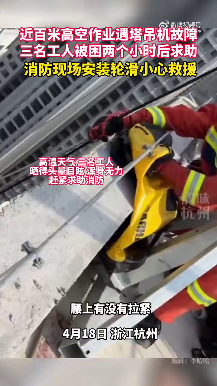 4月18日,浙江杭州。临安某工地三名工人在近百米高空作业时,突然塔吊机故障,三位工人被困2个小时,晒得头晕目眩时才想麻烦消防,消防紧急赶到现场,细心指导成功救援。