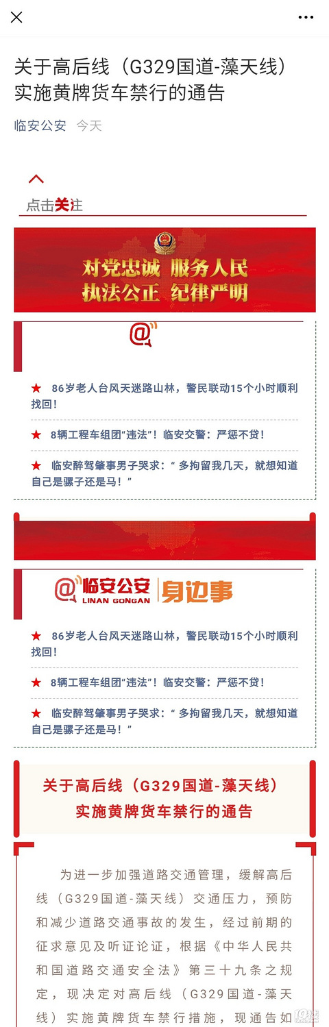 关于高后线(G329国道-藻天线)实施黄牌货车禁行的通告