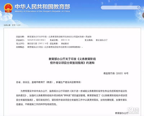 “双减”政策落地以来,针对学科类校外培训机构的规范类文件相继出台。为加强学科类、非学科类校外培训项目鉴定工作的科学性和规范性,11月15日,教育部印发《义务教育阶段校外培训项目分类鉴别指南》(以下简称《指南》)。 ▲教育部官网截图 符合这四个特征即为学科类培训 《指南》明确,如果培训项目符合以下特征,即判定为学科类培训。 一是培训目的,以学科知识与技能培训为导向,主要为提升学科学习成绩服务。 二是