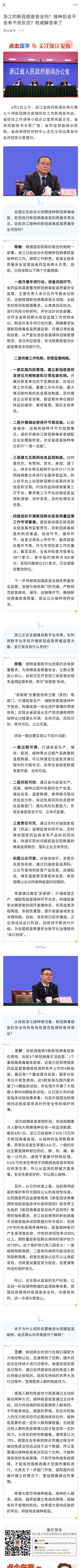 4月2日上午,浙江省政府新闻办举行第七十场新冠肺炎疫情防控工作新闻发布会,省防控工作领导小组办公室常务副主任、省政府副秘书长陈广胜,省药监局副局长陈魁,省疾病预防控制中心主任王桢出席发布会并回答记者提问。 全国正在启动大规模接种新冠病毒疫苗,老百姓对新冠病毒疫苗的质量非常关注,目前浙江接种的新冠病毒疫苗质量安全可控吗? 陈魁:根据国务院联防联控机制统一部署,浙江已经启动大规模新冠病毒疫