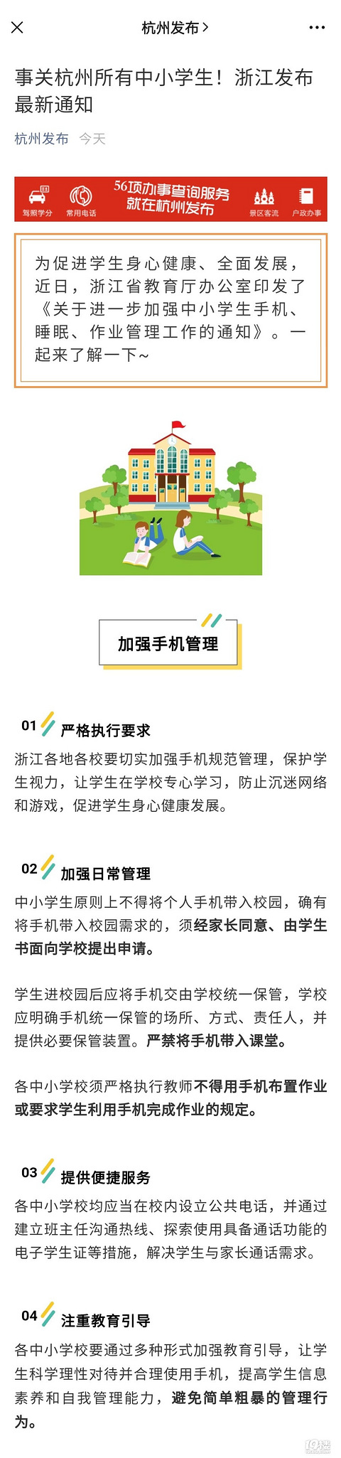 为促进学生身心健康、全面发展,近日,浙江省教育厅办公室印发了《关于进一步加强中小学生手机、睡眠、作业管理工作的通知》。一起来了解一下~加强手机管理01严格执行要求浙江各地各校要切实加强手机规范管理,保护学生视力,让学生在学校专心学习,防止沉迷网络和游戏,促进学生身心健康发展。 02 加强日常管理 中小学生原则上不得将个人手机带入校园,确有将手机带入校园需求的,须经家长同意、由学生书面向学校提出申请