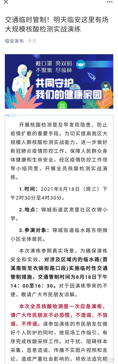 交通临时管制!明天临安这里有场大规模核酸检测实战演练