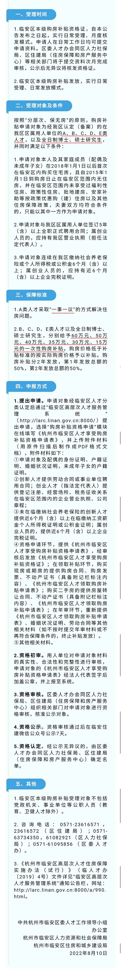 根据《杭州市临安区高层次人才住房保障实施办法(试行)》(临人才办〔2019〕4号)等文件规定,现开展2022年临安区高层次人才区本级购房补贴受理工作,相关事项通告如下:来源:临安住建