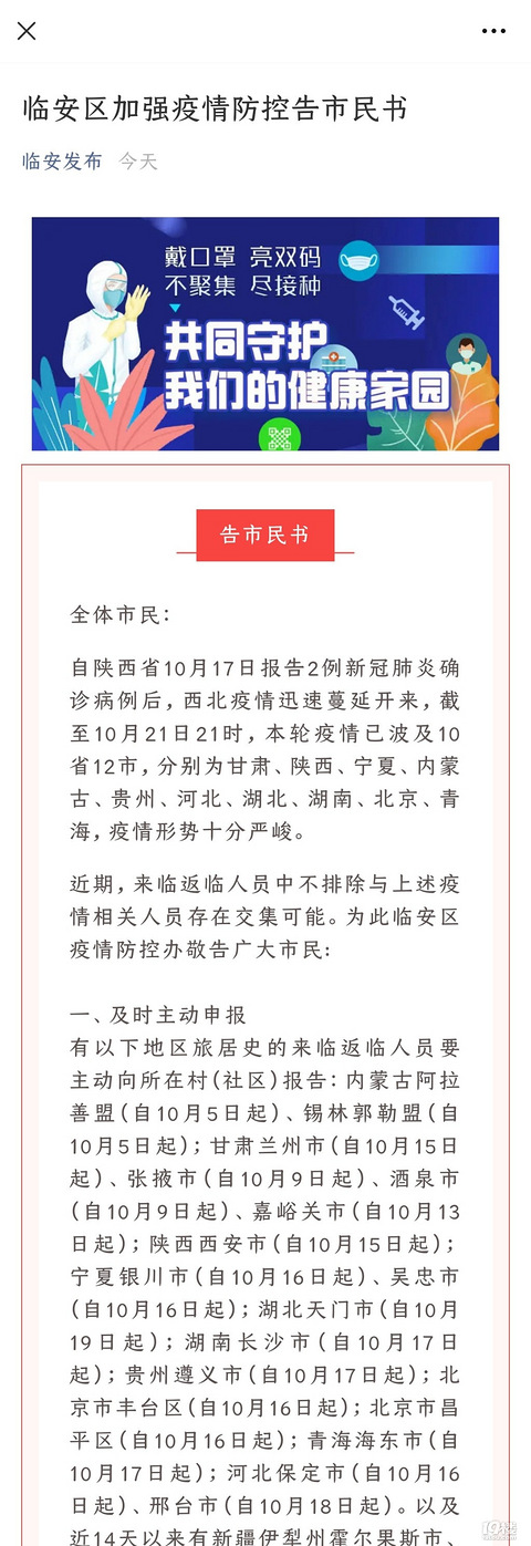 告市民书 全体市民: 自陕西省10月17日报告2例新冠肺炎确诊病例后,西北疫情迅速蔓延开来,截至10月21日21时,本轮疫情已波及10省12市,分别为甘肃、陕西、宁夏、内蒙古、贵州、河北、湖北、湖南、北京、青海,疫情形势十分严峻。近期,来临返临人员中不排除与上述疫情相关人员存在交集可能。为此临安区疫情防控办敬告广大市民: 一、及时主动申报 有以下地区旅居史的来临返临人员要主动向所在村(社区)报告: