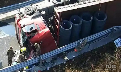 1月19日10时30分许杭州绕城西复线绍兴方向汪家埠枢纽转杭徽高速杭州方向匝道内一辆重型半挂牵引车发生侧翻由于车头严重变形驾驶员被卡在车内不能动弹情况十分危急 杭州高速交警四大队民警接到报警后立即赶往现场 正在此时某部队官兵路过事故现场他们果断将车停靠硬路肩迅速从车上拿出救援工具开展生死营救 时间就是生命半挂车驾驶员王师傅被卡在车内动弹不得,身上多处创伤血流不止,情况万分危险 现场民警一边抚慰王师