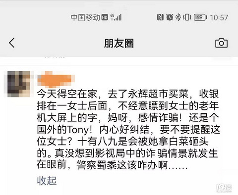 8月26日,郑先生的微信朋友圈内一则信息引起了他的注意:“今天得空在家,去了超市买菜,收银排在一女士后面,不经意瞟到女士的老年机大屏上的字,妈呀。感情诈骗!还是个国外的Tony!内心好纠结,要不要提醒这位女士?十有八九是会被她拿白菜砸头的,真没想到影视剧中的诈骗情景就发生在眼前,警察蜀黍这该咋办啊……”。郑先生心想这不是典型的网络交友诈骗吗?如果不赶紧阻止她,深入聊天后她极有可能成为被骗的受