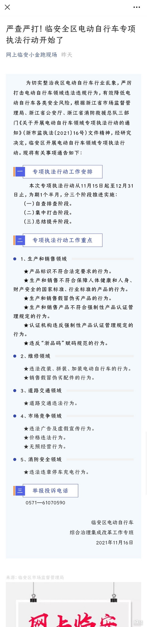 为切实整治我区电动自行车行业乱象,严厉打击电动自行车领域违法违规行为,有效降低电动自行车各类安全风险,根据浙江省市场监督管理局、浙江省公安厅、浙江省消防救援总队三部门《关于开展电动自行车领域专项执法行动的通知》(浙市监执法〔2021〕16号)文件精神,经研究决定,临安区开展电动自行车领域专项执法行动。现将有关事项通告如下: 一专项执法行动工作安排 本次专项执法行动从11月15日起至12月31日止,