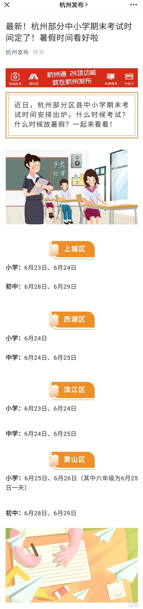 最新!杭州部分中小学期末考试时间定了!暑假时间看好啦
