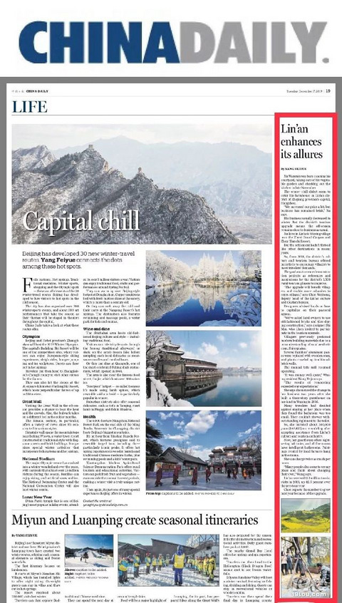 近日中国国家英文日报向全世界推介《中国日报》是中国了解世界、世界了解中国的重要窗口。《中国日报国际版》整合了此前在国外出版发行的中国日报美国版、欧洲版、非洲版等6个本土化海外版资源,面向全球发行,覆盖63个国家和地区的读者。临安正变得越来越有魅力这个冬天,五星村的古银杏树,照常没有挽留她的“金叶子”,但树下的几户人家,却仿佛焕发出一种春天的活力。这种活力四处洋溢,不需要费心探寻。它首先流淌在蒲扇居