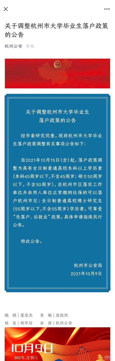 关于调整杭州市大学毕业生 落户政策的公告 经市委研究同意,现将杭州市大学毕业生落户政策调整有关事项公告如下: 自2021年10月15日(含)起,落户政策调整为具有全日制普通高校本科以上学历者(本科45周岁以下,不含45周岁;硕士50周岁以下,不含50周岁),在杭州市区落实工作单位并由用人单位正常缴纳社保的可以落户杭州市区;全日制普通高校博士研究生(55周岁以下,不含55周岁)学历者,可享受“先落户