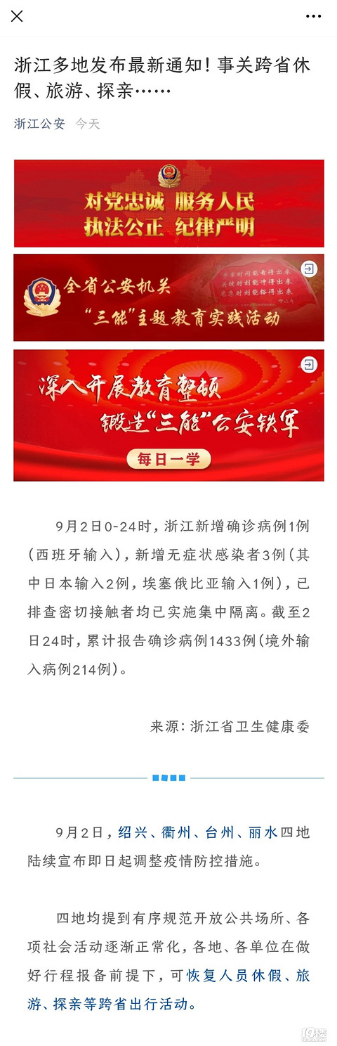 9月2日0-24时,浙江新增确诊病例1例(西班牙输入),新增无症状感染者3例(其中日本输入2例,埃塞俄比亚输入1例),已排查密切接触者均已实施集中隔离。截至2日24时,累计报告确诊病例1433例(境外输入病例214例)。 来源:浙江省卫生健康委 图片 9月2日,绍兴、衢州、台州、丽水四地陆续宣布即日起调整疫情防控措施。 四地均提到有序规范开放公共场所、各项社会活动逐渐正常化,各地、各单位在做好行程