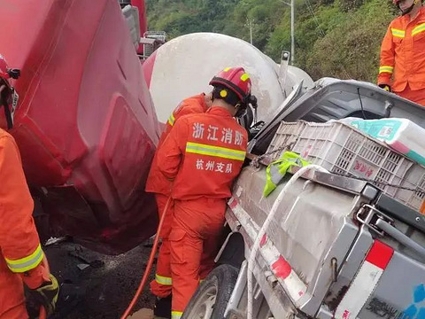 危急!临安英公水库隧道口一大货车侧翻,压住了一辆小货车