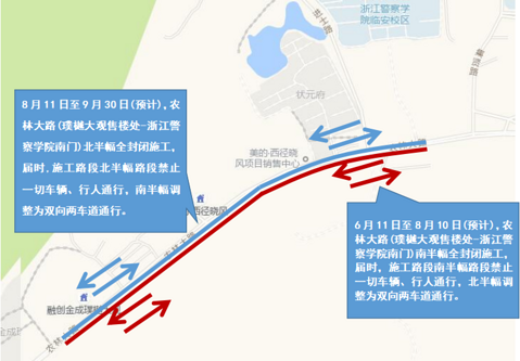 关于农林大路部分路段道路改建工程施工期间调整交通组织措施的通告 _因农林大路部分路段道路改建工程施工需要,为确保道路交通有序、安全, 根据《中华人民共和国道路交通安全法》第39条之规定,公安机关交通管理部门将在施工期间调整相关交通组织措施。现将有关事项通告如下: 2021年6月11日至2021年8月10日(预计) 农林大路(璞樾大观售楼处-浙江警察学院南门)南半幅全封闭施工,届时,施工路段南半幅