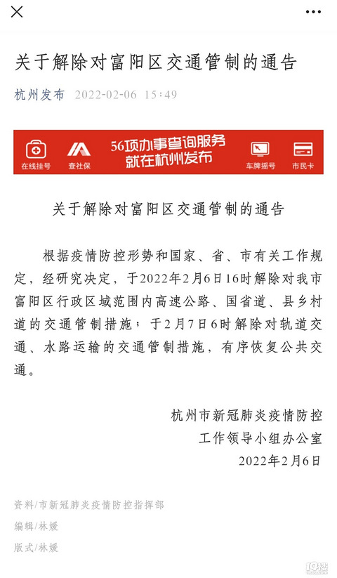 关于解除对富阳区交通管制的通告 根据疫情防控形势和国家、省、市有关工作规定,经研究决定,于2022年2月6日16时解除对我市富阳区行政区域范围内高速公路、国省道、县乡村道的交通管制措施;于2月7日6时解除对轨道交通、水路运输的交通管制措施,有序恢复公共交通。 杭州市新冠肺炎疫情防控工作领导小组办公室2022年2月6日来源:杭州发布
