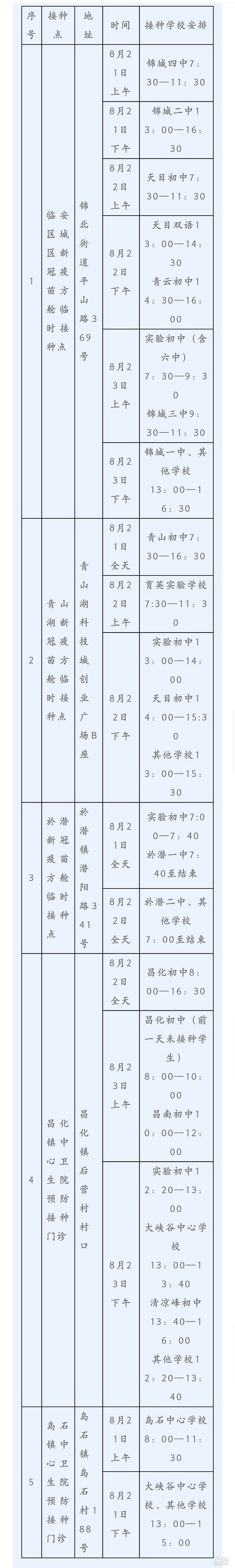 根据《杭州市临安区12-17岁人群新冠病毒疫苗接种工作方案》精神,经区卫健局和教育局协商,报区防疫指挥部同意,我区将在8月21日至23日,面向12周岁以上小学高段和初中段在校学生开展新冠疫苗集中接种。现将有关事项告知如下:接种对象全区12周岁以上的小学高段和初中段在校学生8月21日至23日请符合接种条件的同学们在学校对应的时间段内由家长陪同前往接种。为避免拥挤,请同学们尽量根据分好的时段和学校,前