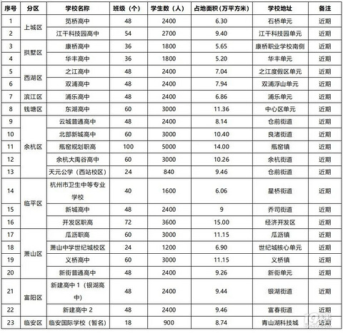 近日,杭州市教育局公布文件《杭州市区高中学校布局规划(2021年-2035年)》,明确近期(2022-2025年)杭州23所新建高中学校名单、班级规模和建设地块具体位置。随小布一起了解~规划范围 本次规划的空间范围为杭州市区,包括上城区、拱墅区、西湖区、滨江区、钱塘区、余杭区、临平区、萧山区、富阳区、临安区十城区。 高中学校是指各种类型高中阶段学校,包括普通高中、职业高中、普通中专、成人中专、技工