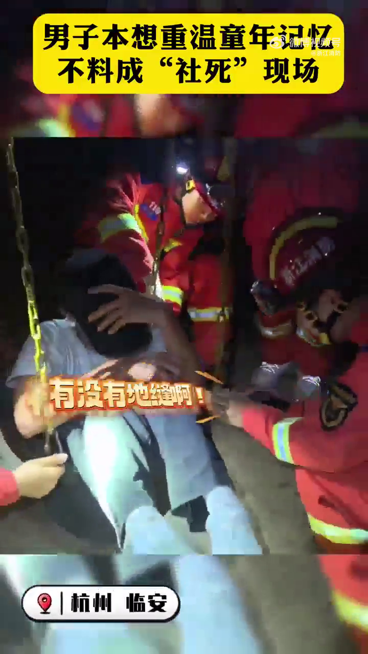 尬出天际!临安小伙玩秋千屁股被卡到动弹不得,消防紧急救援