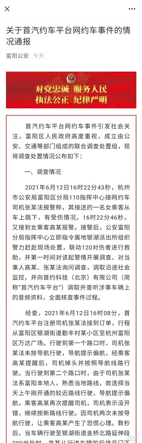 首汽约车平台网约车事件引发社会关注,富阳区人民政府高度重视,成立由公安、交通等部门组成的联合调查处置组,现将调查处置情况公布如下: 一、调查情况 2021年6月12日16时22分43秒,杭州市公安局富阳区分局110指挥中心接网约车司机张某法报警称,其接送的一名女乘客从车上跳下,有受伤情况。16时22分46秒,又接到女乘客高某报警。接警后,公安富阳分局指挥中心立即指令属地银湖派出所组织警力赶赴现