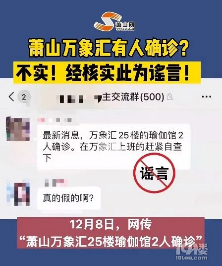 谣言1网传“萧山万象汇25楼瑜伽馆2人确诊”是谣言 12月8日,网传“萧山万象汇25楼瑜伽馆2人确诊”。经北干街道金城楼宇社区工作人员核实,该消息系谣言! 谣言2网传“地铁一号线司机阳性,全体地铁职工核酸检测”?谣言! 12月7日,一则“地铁一号线司机阳性,现在全体职工核酸”消息截图流传,据了解,该消息为谣言。防疫信息请关注相关部门官方消息,请大家不信谣、不传谣,一切以官方发布消息为准。 谣言