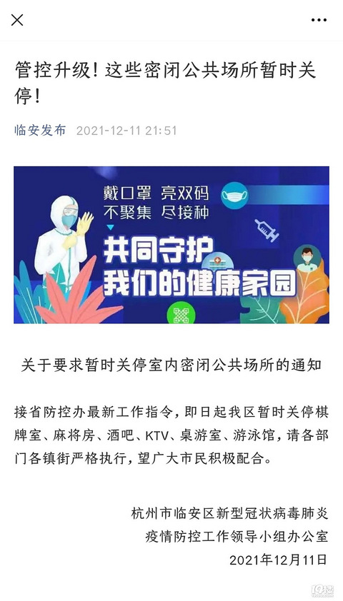 关于要求暂时关停室内密闭公共场所的通知 接省防控办最新工作指令,即日起我区暂时关停棋牌室、麻将房、酒吧、KTV、桌游室、游泳馆,请各部门各镇街严格执行,望广大市民积极配合。 杭州市临安区新型冠状病毒肺炎 疫情防控工作领导小组办公室 2021年12月11日来源:临安发布