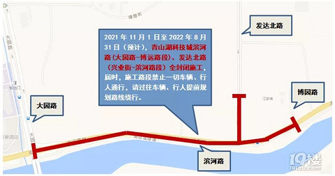 关于青山湖科技城滨河路、发达北路部分路段调整交通组织措施的通告 因青山湖科技城发达路跨南苕溪桥梁及接线工程施工需要,为保证车辆通行安全,解决通行和施工矛盾,根据《中华人民共和国道路交通安全法》第39条之规定,公安机关交通管理部门将在施工期间调整相关交通组织措施,现将有关事项通告如下: 2021年11月1日至2022年8月31日(预计),青山湖科技城滨河路(大园路-博远路段)、发达北路(兴业街-滨河