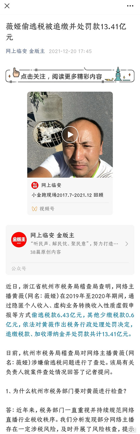 薇娅偷逃税被追缴并处罚款13.41亿元