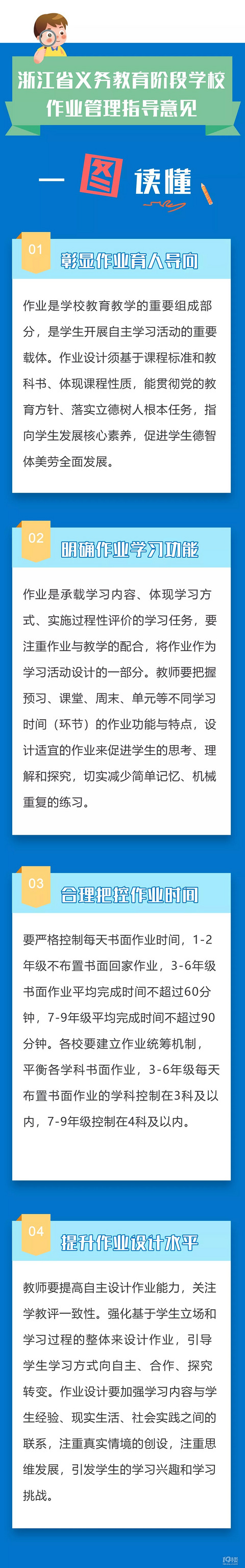 为贯彻落实国家和浙江省“双减”工作有关要求,进一步规范学校教育教学管理,全面提高教育教学质量,坚决扭转部分学校作业数量过多、质量不高、功能异化等突出问题,现就加强义务教育阶段学校作业管理提出以下指导意见。一起来看具体内容↓↓↓来源:浙江发布