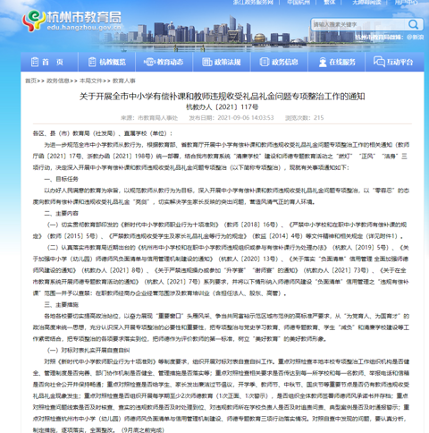 昨天下午,杭州市教育局网站发布《关于开展全市中小学有偿补课和教师违规收受礼品礼金问题专项整治工作的通知》。 文件中提到,要深入开展专项整治行动,以“零容忍”的态度向教师有偿补课和违规收受礼品礼金“亮剑”,解决学生家长反映的突出问题。 具体要查以下内容: 一、严禁中小学校和在职中小学教师有偿补课 1.严禁中小学校组织、要求学生参加有偿补课; 2.严禁中小学校与校外培训机构联合进行有偿补课; 3.严禁
