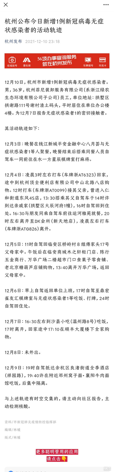 杭州公布今日新增1例新冠病毒无症状感染者的活动轨迹