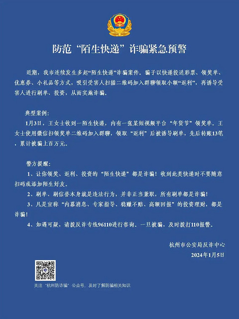 年关将近,不少市民朋友们都在抓紧“买买买”而后等收快递的路上。近期,已连续发生多起“陌生快递”诈骗案件。杭州市公安局反诈中心发布紧急提醒↓↓↓ 来源/杭州发布 杭州公安