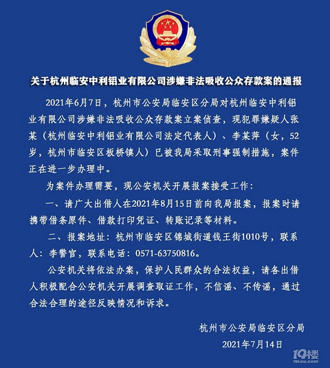 关于杭州临安中利铝业有限公司涉嫌非法吸收公众存款案的通报