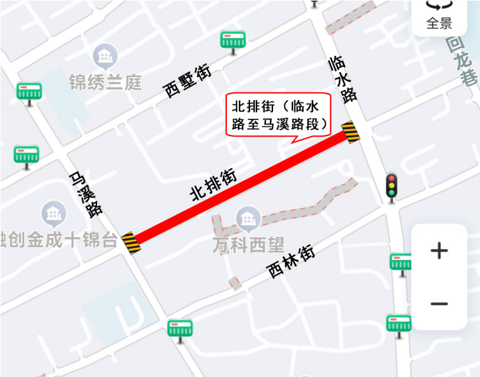 关于北排街(临水路至马溪路段)施工期间调整交通组织措施的通告 因北排街(临水路至马溪路段)道路提升改造施工需要,为确保道路交通安全、畅通、有序,根据《中华人民共和国道路交通安全法》第39条之规定,公安机关交通管理部门将在施工期间调整相关交通组织措施,现将有关事项通告如下: 2023年2月13日至2023年3月3日(预计),北排街(临水路至马溪路段)将采取全封闭施工,施工期间,上述路段将禁止一切车辆