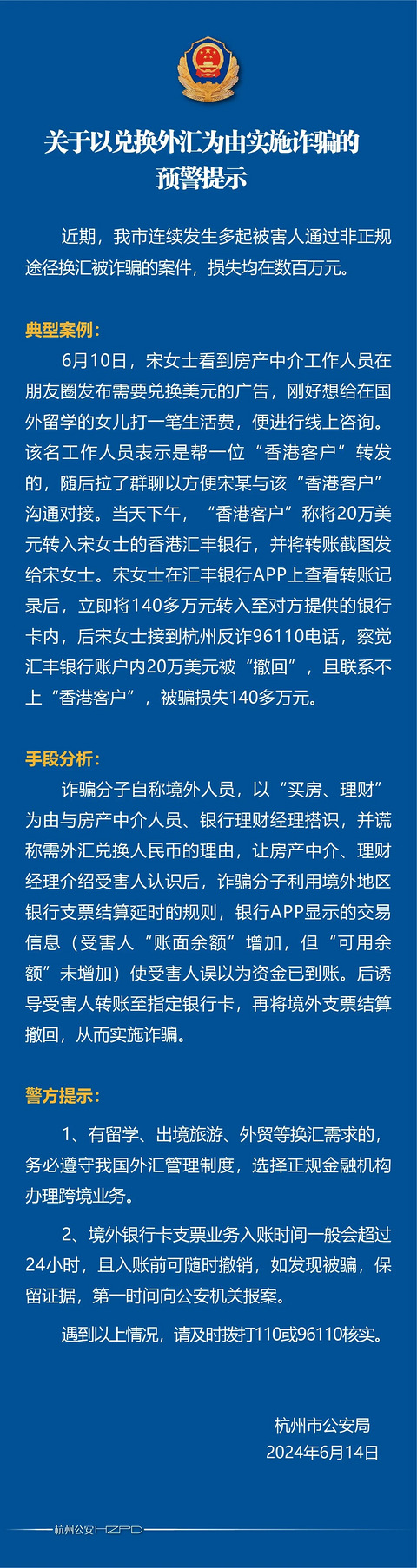杭州近期发生多起以兑换外汇为由实施诈骗的案件,警方发布紧急提醒!一起来看↓↓ 来源:杭州发布