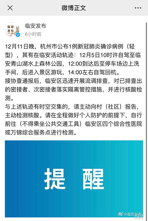 12月11日晚,杭州市公布1例新冠肺炎确诊病例(轻型),其有在临安活动轨迹:12月5日10时许自驾至临安青山湖水上森林公园,12:00到达后至停车场边上洗手间,后进入景区游玩,14:00左右自驾回杭。接协查通报后,临安区迅速开展流调排查,对已排查出的密接者、次密接者落实隔离管控措施,并进行核酸检测。与上述轨迹有时空交集的,请主动向村(社区)报告,主动检测核酸。请在全程做好个人防护的前提下,自行前往
