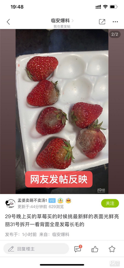 【小金跑现场】第465期“关注食品安全”网友“孟婆卖药不卖汤1”临安19楼发帖:3月29号晚上在临安宝龙广场永辉超市。购买的草莓当时挑最新鲜的表面光鲜亮丽,3月31号拆开一看,背面全是发霉长毛的。金版主看到该帖子后,马上联系了区市场监管部门,执法人员立竿见影,第二天马上对超市进行了检查。 2021年4月1日上午,区市场监管局执法人员对永辉超市(临安宝龙广场店)进行了检查,该店店长李刚现场陪同检查,