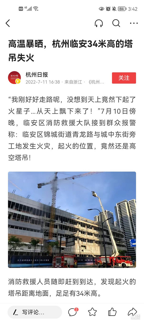 ?高温暴晒,杭州临安34米高的塔吊失火