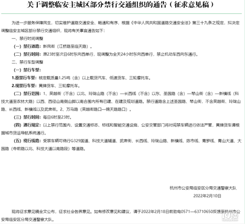 关于调整临安主城区部分禁行交通组织的通告(征求意见稿)