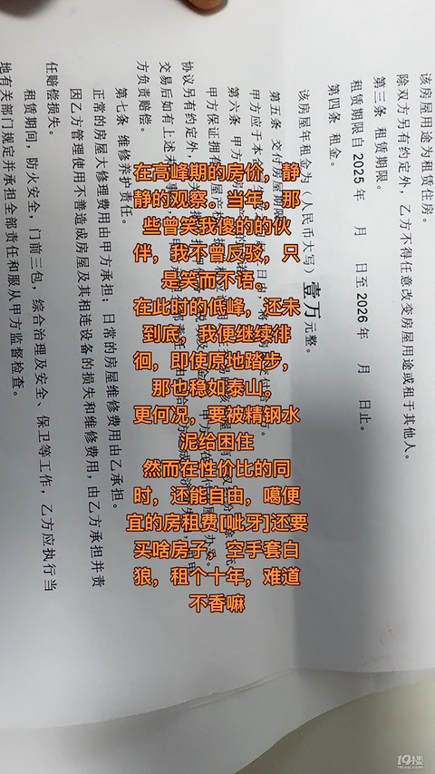 在高峰期的房价,静静的观察。当年,那些曾笑我傻的的伙伴,我不曾反驳,只是笑而不语。在此时的低峰,还未到底,我便继续徘徊,即使原地踏步,那也稳如泰山。更何况,要被钢筋水泥给困住。 然而在性价比的同时,还能自由,噶便宜的房租费[呲牙]还要买啥房子,空手套白狼,租个十年,难道不香嘛