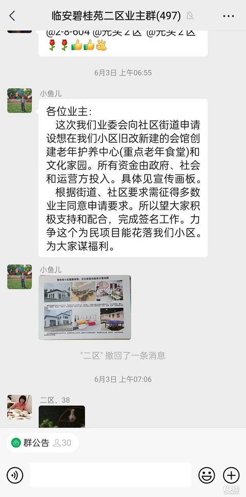 各位领导: 我们是浙江省杭州市临安区碧桂苑二区业主,现就2022年6月3日上午6点55分,业委会主任俞新水(小鱼儿)在小区业主群向业主发布:关于用小区旧改绿化地新建会馆申请在碧桂苑二区内创建锦北街道养护服务中心的通知,作如下真实意愿的一些真实民情反应和不同意申请锦北街道养护服务中心申请花落我家(我们小区)的观点。(业委会通知与宣传图报图附后)信息一出业主群就迎来业主们反对声阵阵。(与