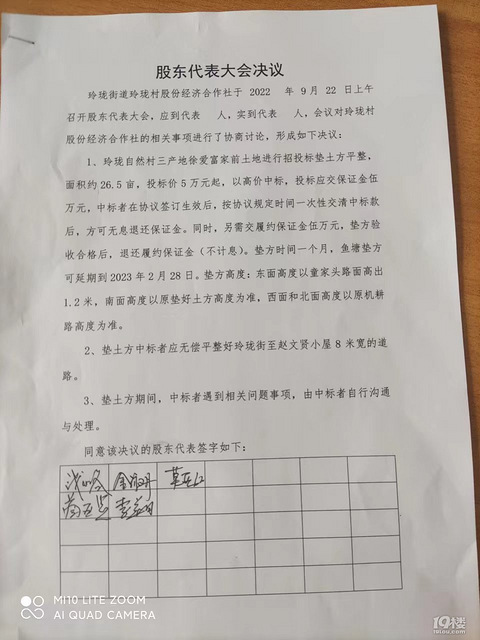 股东代表大会决议玲珑街道玲珑村股份经济合作社于2022月22日上午召开股东代表大会,应到代表人,实到代表人,会议对玲珑村股份经济合作社的相关事项进行了协商讨论,形成如下决议:1、玲珑自然村三产地徐爱富家前土地进行招投标垫土方平整,面积约265亩,投标价5万元起,以高价中标,投标应交保证金伍万元,中标者在协议签订生效后,按协议规定时间一次性交清中标款后,方可无息退还保证金。同时,另需交履约保证金伍万