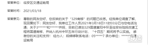 临安区交通运输局答复,329国道南移将在”十四五“期间实施