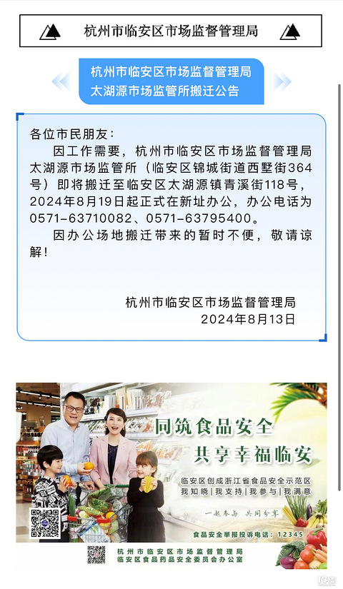 各位市民朋友: 因工作需要,杭州市临安区市场监督管理局太湖源市场监管所(临安区锦城街道西墅街364号)即将搬迁至临安区太湖源镇青溪街118号,2024年8月19日起正式在新址办公,办公电话为0571-63710082、0571-63795400。 因办公场地搬迁带来的暂时不便,敬请谅解! 杭州市临安区市场监督管理局2024年8月13日