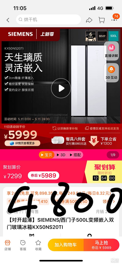 之前西门子淘宝官方旗舰店买的,无拆封,想换个银色,目前价格官方店5999,我现在4800转卖了哦,临安地区自提哦。